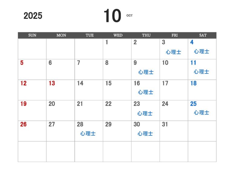 心理士による10月のカウンセリング日は以下の日程です。(「心理士」と記載されている日)