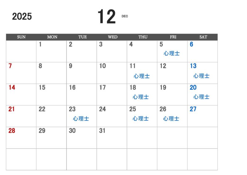 心理士による12月のカウンセリング日は以下の日程です。(「心理士」と記載されている日です)